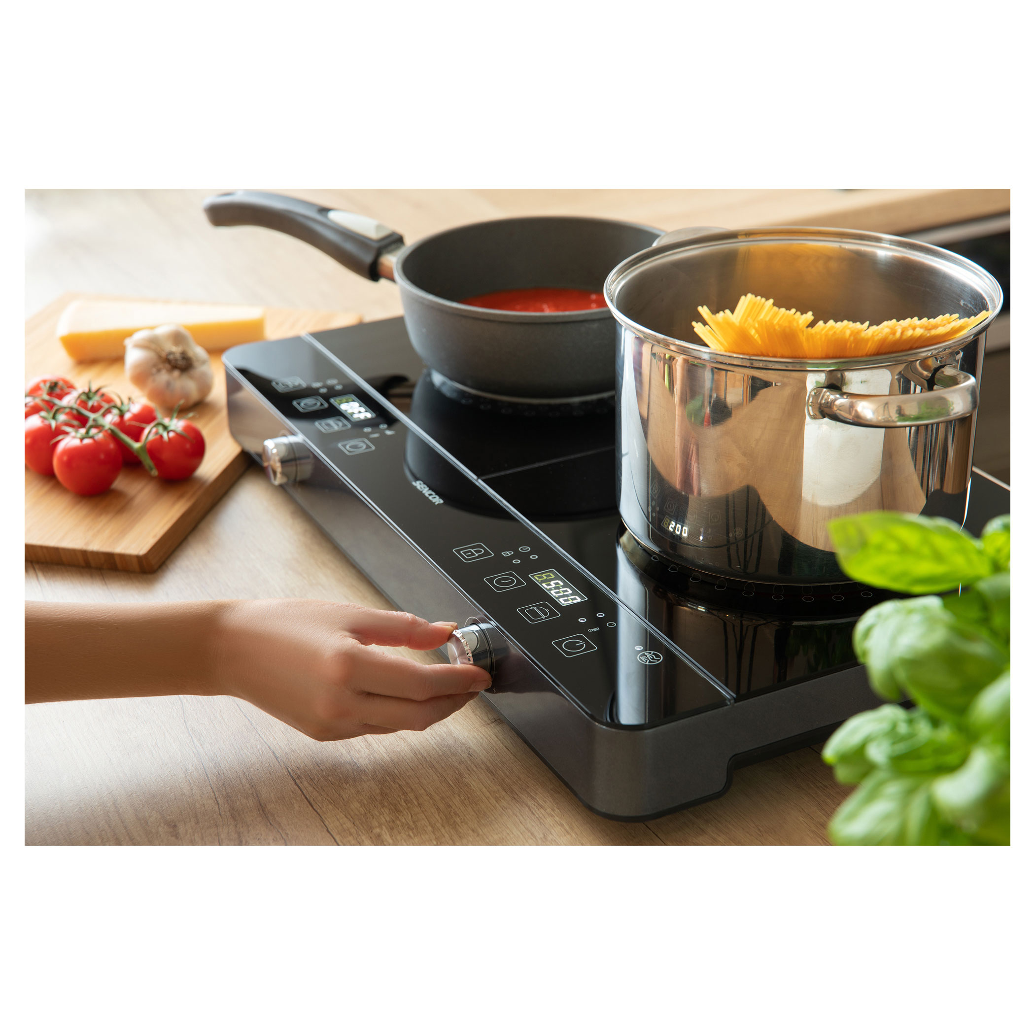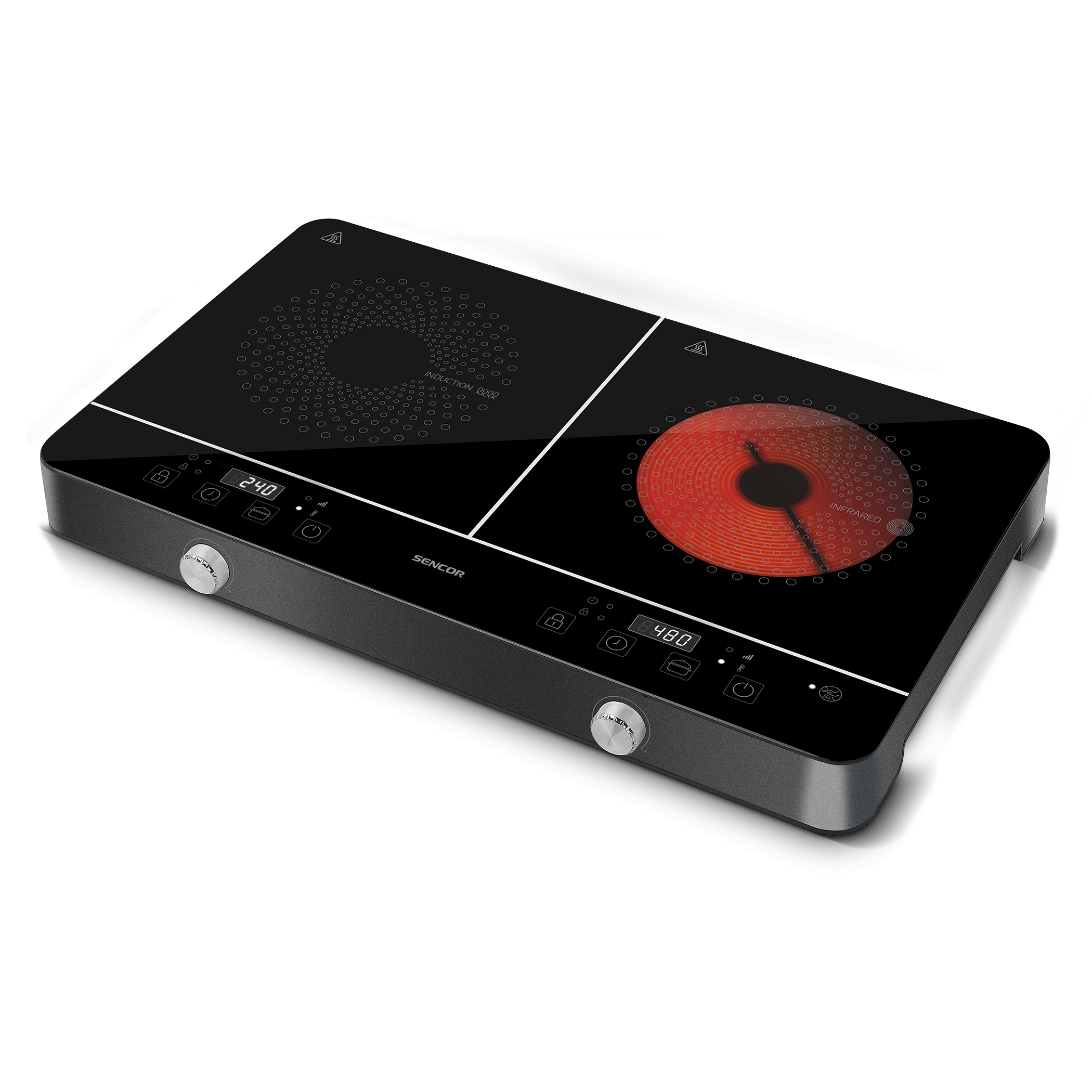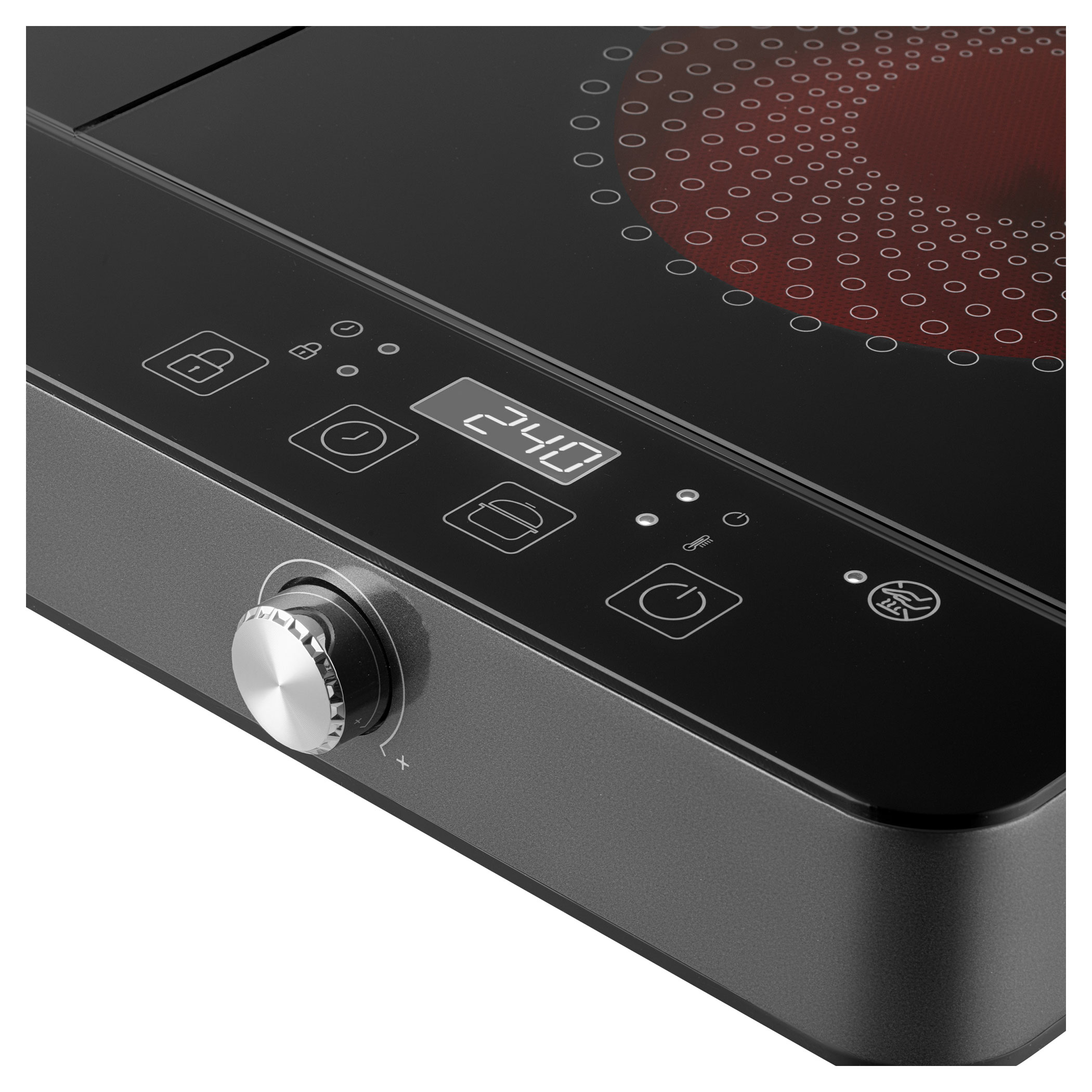 يوفر لوح التسخين بالتحريض الأيسر جميع مزايا الطهي بالتحريض. يمكن ضبط الطاقة بعشر زيادات تتراوح ما بين 200 إلى 1600 واط أو يمكن تحديد التحكم في درجة الحرارة في النطاق من 60 إلى 240 درجة مئوية.