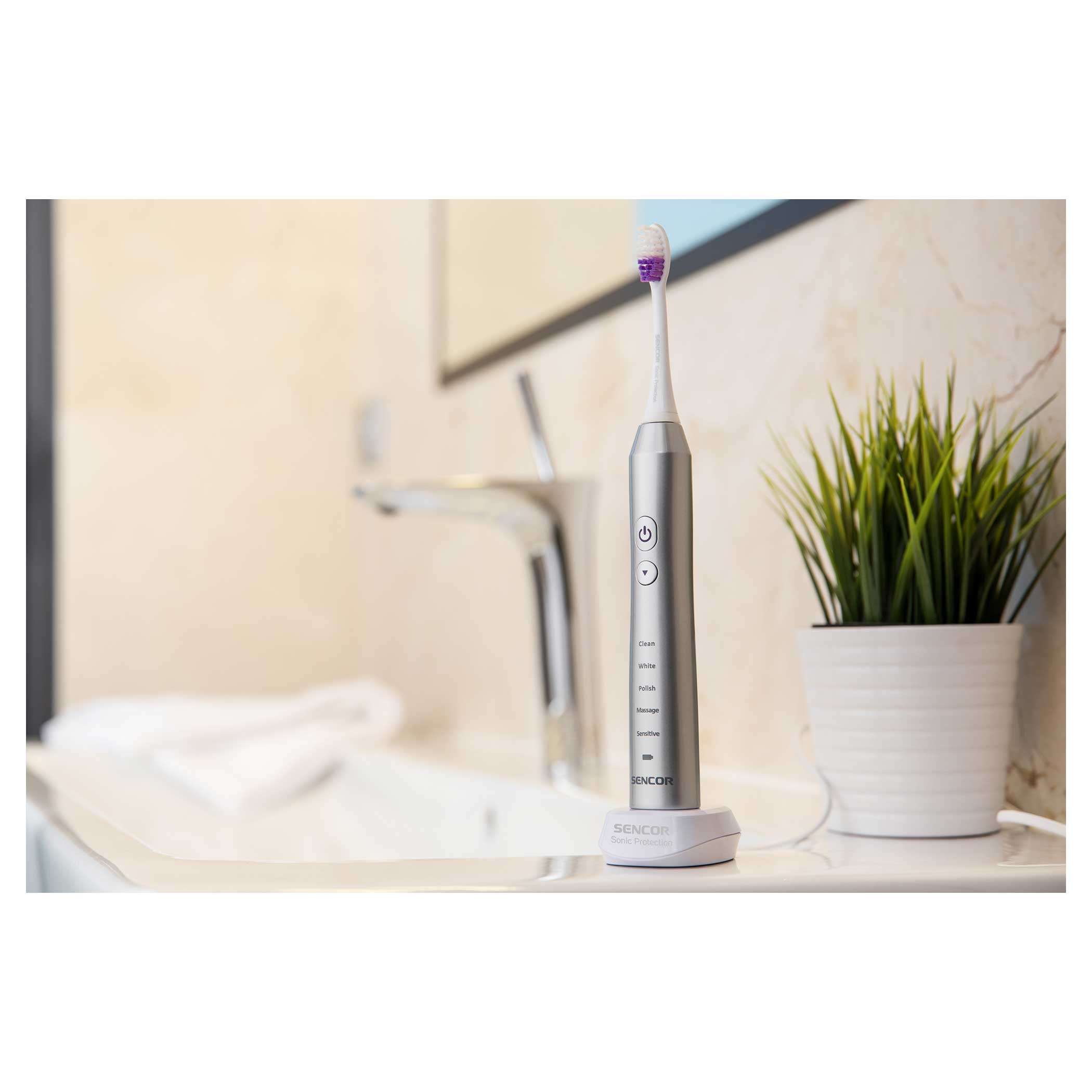 المحتويات المُضمنة: 1 هيكل فرشاة أسنان، 2 رؤوس أساسية، 1 محطة شحن مع حامل في واحد،